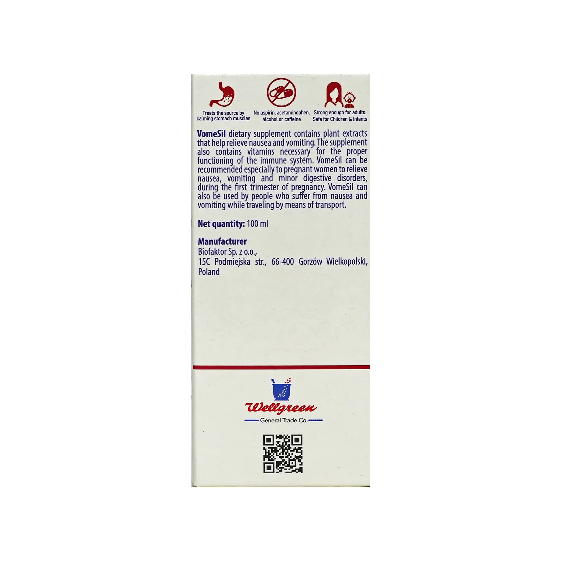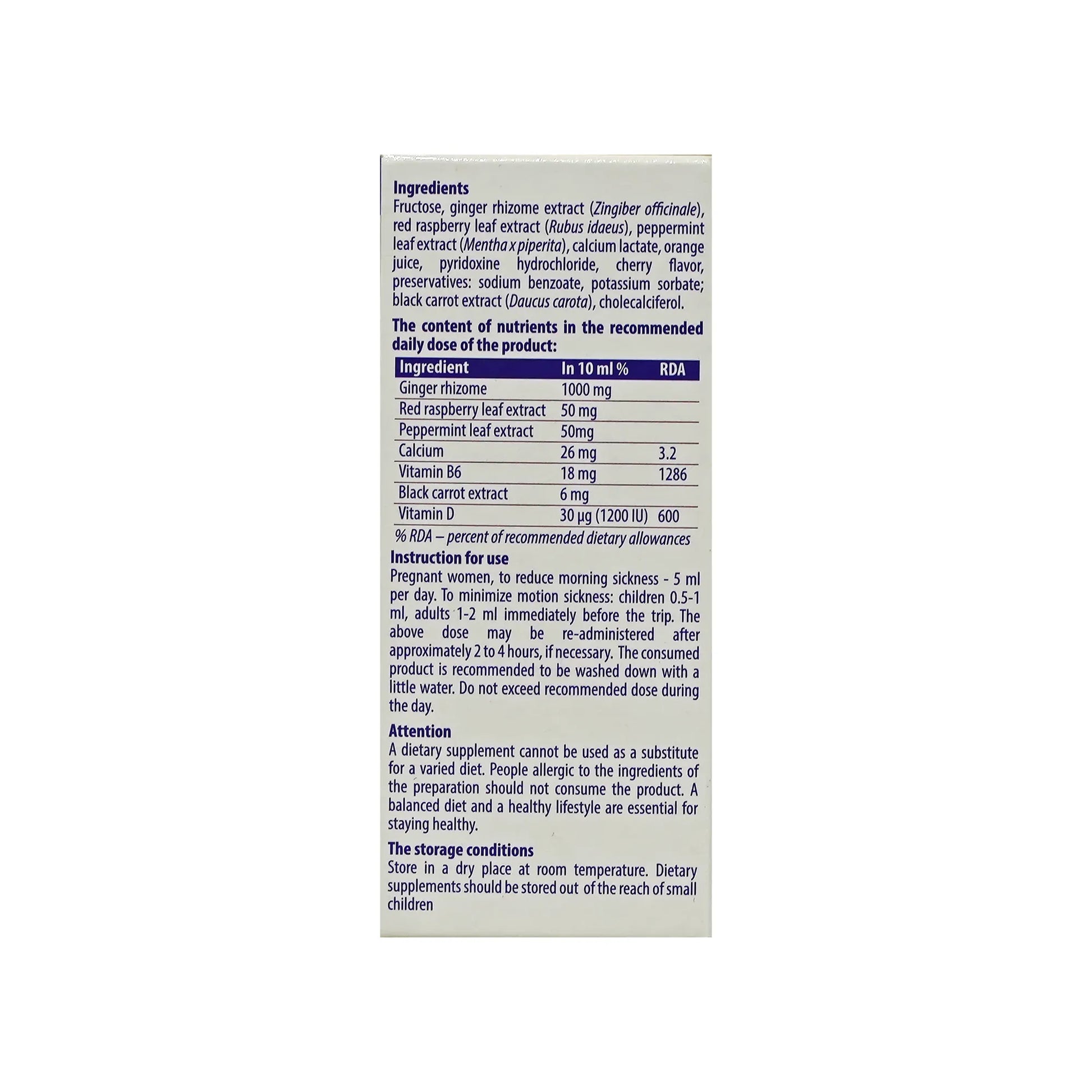 A syrup containing a blend of plant extracts, vitamin D, and calcium. It helps reduce symptoms of nausea and vomiting, whether caused by pregnancy or motion sickness, making it suitable for adults, children, and pregnant women.