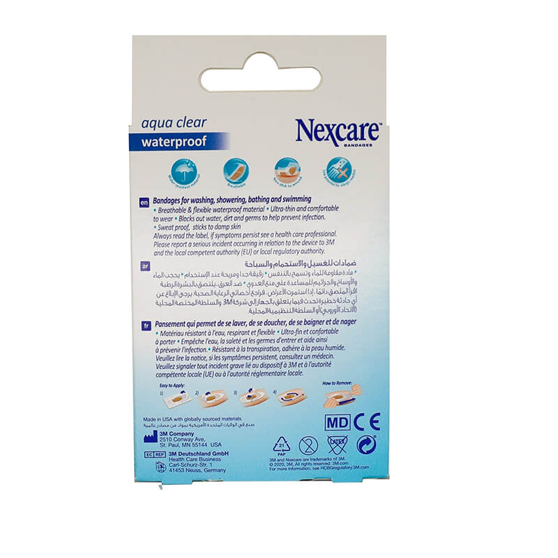 Nexcare bandages are ultra-thin, non-stick, breathable, flexible construction with a 360-degree seal that protects against water, dirt, and germs.A unique bandage shape provides exceptional waterproof protection, Adhesive seals provide the optimal healing environment that promotes healing and helps prevent infection.